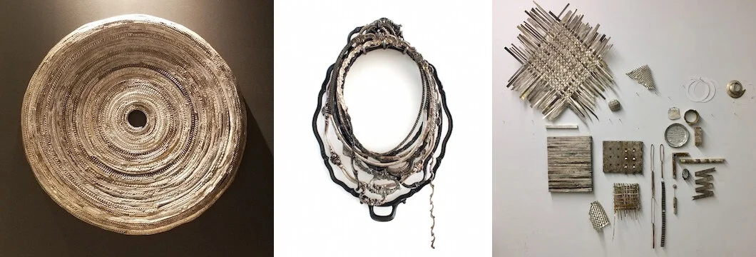 While searching thrift stores for materials for these pieces, he began encountering silverplate platters and trays. He found himself wondering what would happen to the meaning of these objects if he dissected them into parts and combined selected elements together—not unlike the way we distill our life stories into key significant moments. I thought of births and deaths; marriages, graduations, even divorces.